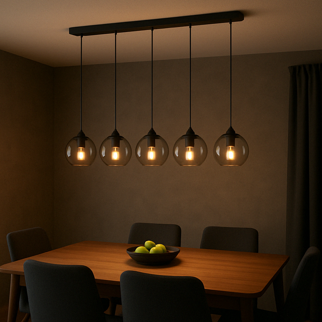Añada un toque de sofisticación industrial a su espacio con la lámpara colgante Industrial Elegance Glass Globe, disponible en configuraciones de 3, 4 o 5 luces. Con globos de vidrio transparente suspendidos de una barra negra estilizada, esta lámpara resalta las bombillas expuestas para una cálida iluminación ambiental. Ideal para comedores, cocinas e interiores modernos de estilo loft.